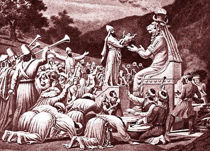 Como el médico y psicoanalista Arnaldo Rascovsky escribió en su obra El filicidio (1981), los sacrificios humanos perpetrados por padres sobre sus hijos “son universales y se presentan en todos los grupos sociales, tanto primitivos como en los contemporáneos”. Es el caso que nos atañe ahora, el del ritual molk, dedicado a la divinidad fenicia y cananea Moloch, en el cual bebés eran ofrecidos por sus propios padres para ser sacrificados.
