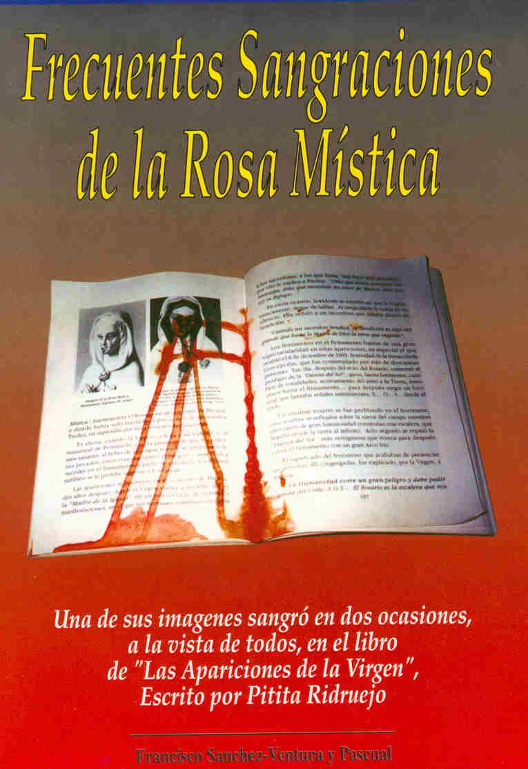 Otro hecho realmente dudoso, pero que alcanzó especial trascendencia, fue el de la sangración del libro “Apariciones de la Virgen María”, escrito por Pitita Ridruejo. A mediados de 1994, la conocida marióloga regaló un ejemplar de su obra a Carmen López. En el momento en que Pitita se encontraba en el exterior de la finca hablando con los asistentes, apareció la vidente con signos de nerviosismo enseñando a los presentes una de las páginas del libro, en la que una fotografía de la “Rosa Mística” estaba sangrando. Pitita y los allí reunidos no dieron crédito a lo que veían sus ojos. Después de no pocos titubeos, Carmen dejó que el médico malagueño Sergio Triay -a quien Pitita puso al corriente del suceso- se acercara hasta la finca y empapara un algodón en la sangre presuntamente emanada del libro, aún fresca ya que hubo nuevas sangraciones dias después. El análisis arrojó como resultado que era sangre humana. Obviamente, ello no determina ningún origen milagroso al hecho, aparte de que el propio médico reconoció que no fue un examen muy exhaustivo el que llevó a cabo: “No puedo decir que fue un análisis científico ni mucho menos. Fue una cosa para satisfacer mi curiosidad”. Hay puntos muy oscuros en esta historia, y ello lo demuestra el hecho de que la vidente se oponga radicalmente a que el libro, expuesto actualmente en una vitrina, sea llevado a un laboratorio para ser analizado en profundidad.
