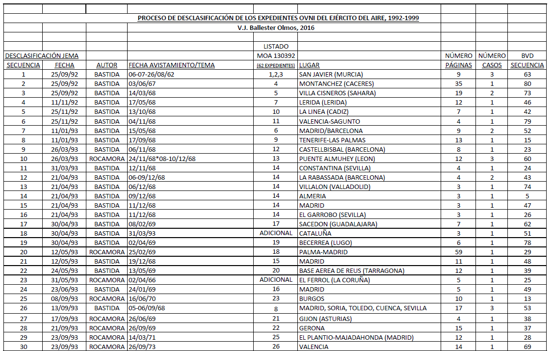 Siguiendo la tónica de otros muchos países (Estados Unidos, Inglaterra, Francia, Australia, Nueva Zelanda, Canadá, Dinamarca, etc.), el Ministerio de Defensa español ha escaneado finalmente los expedientes desclasificados y los ha subido a la red. Entre 1992 y 1999, el Ejército del Aire español, a través de la sección de Inteligencia del Mando Operativo Aéreo, MOA (más tarde denominado Mando Aéreo de Combate, MACOM) recopiló, ordenó y desclasificó toda la documentación concerniente a ovnis que se localizó en el Estado Mayor del Aire y en las regiones aéreas. Consistía en 122 casos distintos ocurridos entre 1962 y 1995, que se agruparon en 84 expedientes: 82 eran de casuística (incluyendo 4 llamados “bises”, por contener información hallada con posterioridad) y otros 2 con listados y normativa histórica, haciendo un total de 1.953 páginas.