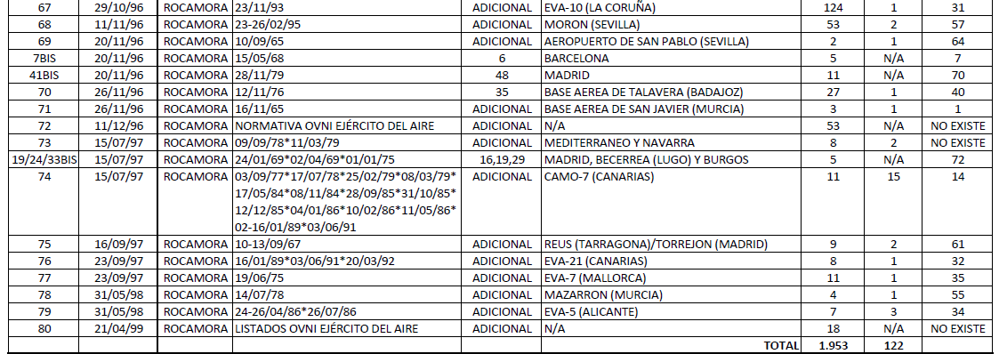 Tengo pendiente reunir esas 13 anotaciones y transmitirlas al Jefe del Estado Mayor del Aire (JEMA), para que se cree con ellas un último expediente ovni. Pero sirva de momento este índice de los casos encontrados. En la siguiente tabla, por información “complementaria” se entiende que ya existe un informe desclasificado para el caso e información “adicional” significa que se trata de un avistamiento nuevo.