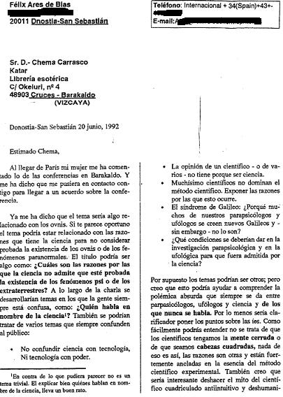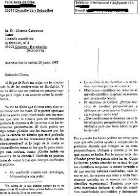 * Ares de Blas se caracteriza por su grosería y sexismo. En carta personal al autor, del 24 de agosto del 92, y en relación a Carmen Perez de la Hiz escribía: “Y te lo digo con sinceridad, a ti estoy dispuesto a dedicar muchas más horas (a entendernos) que al resto de la mesa (se refiere a la mesa redonda del curso de OVNIs de la Complutense)… y sobretodo al representante femenino, al que no estoy dispuesto a dedicarle más allá de media hora”.