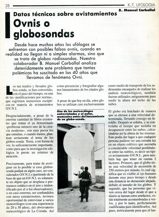 La polémica atribución de ser un globosonda al OVNI de Iñás reactivo una vieja polémica: ¿puede un globosonda se confundido con un OVNI como han pretendido los escépticos en miles de ocasiones? Sorprendentemente no existe mucha bibliografía concreta sobre la dimensión ufológica del radiosondeo meteorológico, por eso hemos rescatado de nuestro archivo uno de los pocos textos publicados al respecto. El presente artículo, y ese es parte de su valor histórico, fue publicado por Manuel Carballal en el número 175 de la revista Karma-7, correspondiente al número de junio de 1987. Pero a pesar de que ha transcurrido 22 años desde su publicación, sigue conteniendo una información muy interesante y útil. A pesar de haber transcurrido más de dos décadas desde su confección, algo que se evidencia en la redacción del texto.