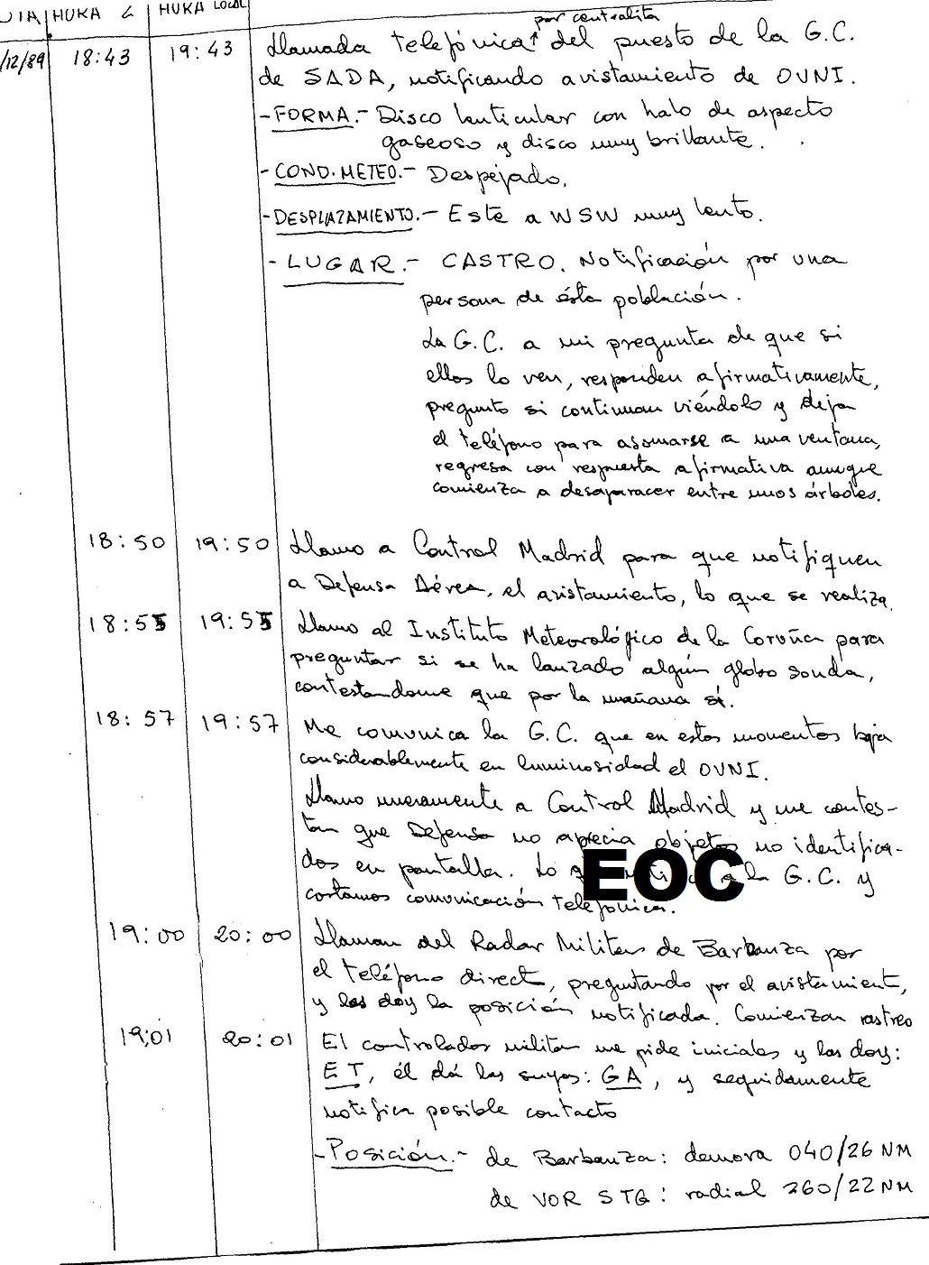 Según su relato, Eladio Tapia estaba de guardia en aquel mismo Centro de Control en la tarde del 5 de diciembre de 1989. Exactamente a las 19:43 recibió una llamada telefónica de la Casa-Cuartel de la Guardia Civil de Sada, población costera coruñesa, reportándole que habían recibido una denuncia de un astrónomo aficionado de la cercana localidad de O Castro, porque estaba viendo un objeto no identificado con su telescopio.