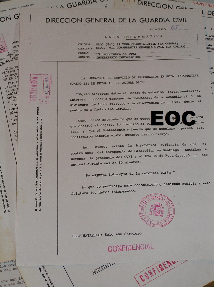 En relación a lo ocurrido en Sada-Santiago-Barbanza, si existía alguna información oficial inédita, solo podía encontrarse en el despacho del General de la 611ª Comandancia. El problema es que, como demuestran los sellos que preceden todos los informes OVNI oficiales de la Guardia Civil, estos expedientes continúan clasificados como confidenciales. Pese a ello, los consejos de mi fuente y una buena dosis de suerte, me permitieron acceder a varios informes sobre OVNIs que se conservan en dicha comandancia. Destaca entre ellos la nota informativa redactada en la Casa Cuartel de Sada en relación a este incidente. Estoy seguro de que los aficionados a la investigación comprenderán el entusiasmo del autor al poder acceder a estos documentos clasificados originales, no fotocopias, en los que encontramos informaciones sorprendentes.
